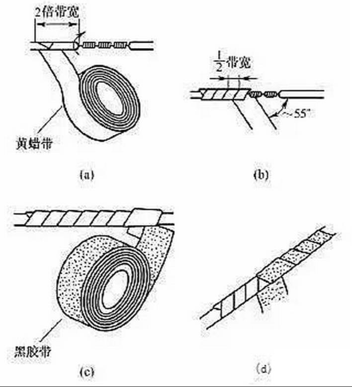 一字形連接的導線接頭可按圖20所示進行絕緣處理,先包纏一層黃蠟帶,再包纏一層黑膠布帶。將黃蠟帶從接頭左邊絕緣完好的絕緣層上開始包纏,包纏兩圈后進入剝除了絕緣層的芯線部分[見圖20(a)]。包纏時黃蠟帶應與導線成55°左右傾斜角,每圈壓疊帶寬的1/2[見圖20(b)],直至包纏到接頭右邊兩圈距離的完好絕緣層處。然后將黑膠布帶接在黃蠟帶的尾端,按另一斜疊方向從右向左包纏[見圖20(c)、圖20(d)],仍每圈壓疊帶寬的1/2,直至將黃蠟帶完全包纏住。包纏處理中應用力拉緊膠帶,注意不可稀疏,更不能露出芯線,以確保絕緣質量和用電安全。對于220V線路,也可不用黃蠟帶,只用黑膠布帶或塑料膠帶包纏兩層。在潮濕場所應使用聚氯乙烯絕緣膠帶或滌綸絕緣膠帶。2xn拖鏈電纜-聚氨酯卷筒電纜-高柔性坦克鏈電纜廠家
