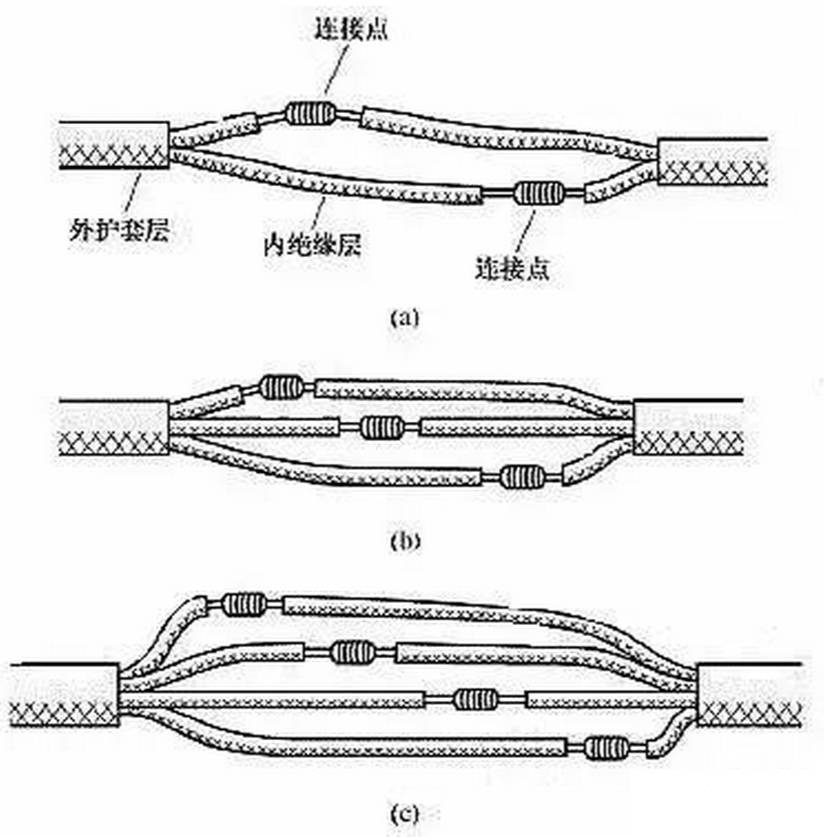 (7)雙芯或多芯電線電纜的連接。雙芯護套線、三芯護套線或電纜、多芯電纜在連接時,應注意盡可能將各芯線的連接點互相錯開位置,可以更好地防止線間漏電或短路。圖11(a)所示為雙芯護套線的連接情況,圖 11(b)所示為三芯護套線的連接情況,圖11(c)所示為四芯電力電纜的連接情況。2xn拖鏈電纜-聚氨酯卷筒電纜-高柔性坦克鏈電纜廠家