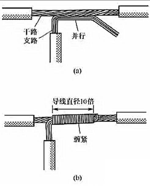 (4)多股銅導線的分支連接。多股銅導線的T字分支連接有兩種方法,一種方法是將支路芯線90°折彎后與干路芯線并行[見圖7(a)],然后將線頭折回并緊密纏繞在芯線上即可[見圖7(b)]。2xn拖鏈電纜-聚氨酯卷筒電纜-高柔性坦克鏈電纜廠家