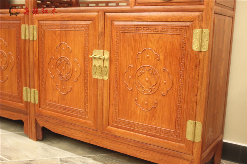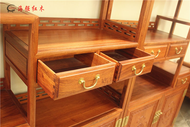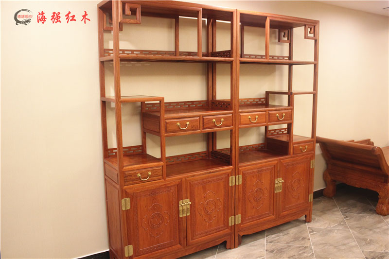 此款博古架帶有四個(gè)抽屜和兩個(gè)柜。方便儲(chǔ)存物品。
