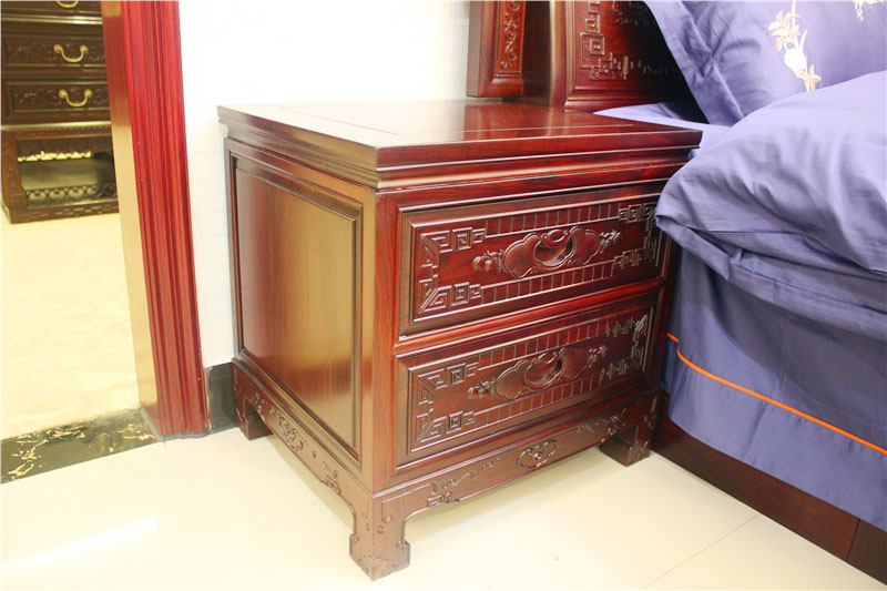 床頭柜上下兩個(gè)抽屜,與床箱雕刻相統(tǒng)一,手工打磨的元寶型凹槽拉手,貼合手部,手感細(xì)膩光滑,內(nèi)彎馬蹄足,敦實(shí)有力,穩(wěn)定性好。